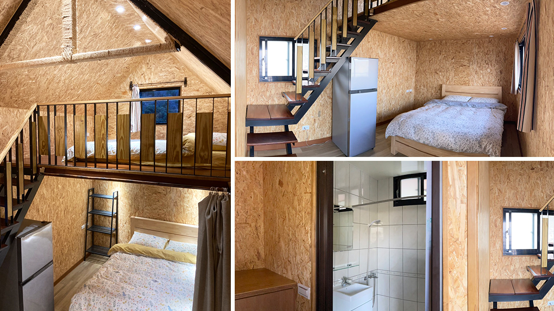 F區:1號屋&2號屋-格局相同,上下層寢室、衛浴(電熱水器)、冰箱、置物架