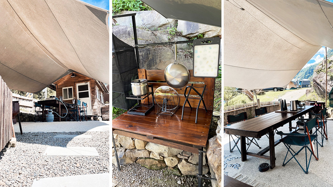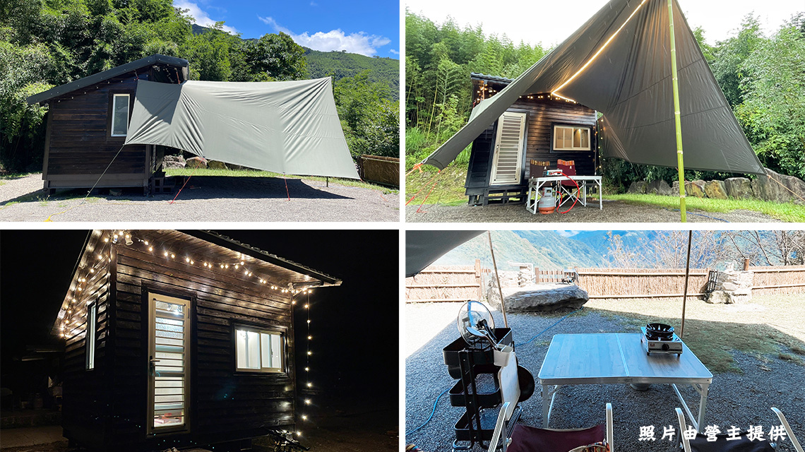 ※ 屋外設備:活動式遮雨棚、露台、流理台(供應熱水)、燈條、單口瓦斯爐*2個(含瓦斯)+焚火台*1(可以烤肉)+暖爐*1(不含煤油) +4人餐桌椅。