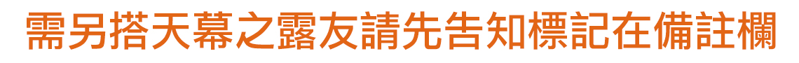 ※ 戶外區:每營位限搭1睡帳、1停車位、1客廳帳(或天幕)。此區可搭天幕,需備註訂單告知。