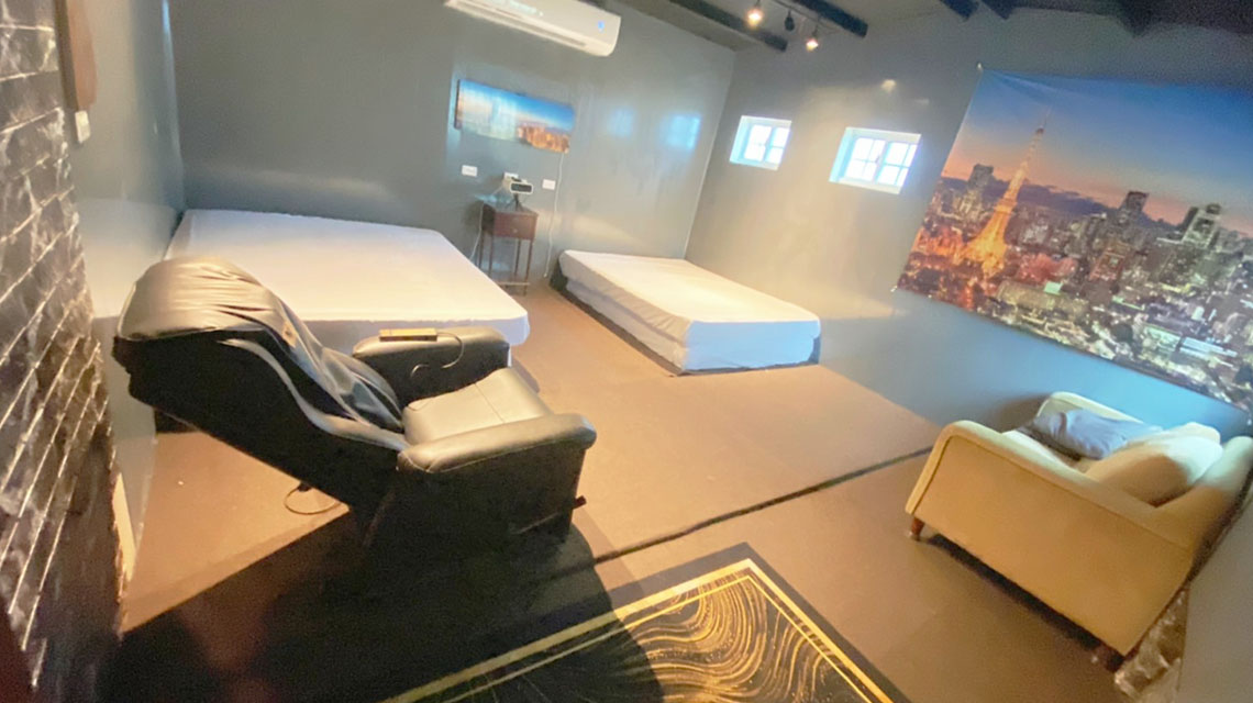 ※ 室內提供:客廳區桌椅,冷暖氣、按摩椅、投影機/250吋投影幕、兩張雙人彈簧床(附床包),(寢具(枕頭/棉被) 需自備)。