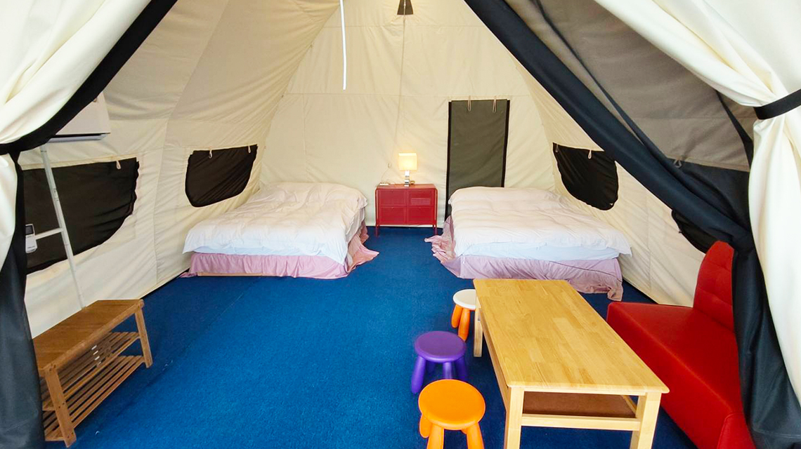 ※ 帳篷內皆附有:2張雙人床、飯店級棉被組、電視、冷氣、室內桌椅、床頭燈、照明燈、獨立插座、含衛浴、吹風機。