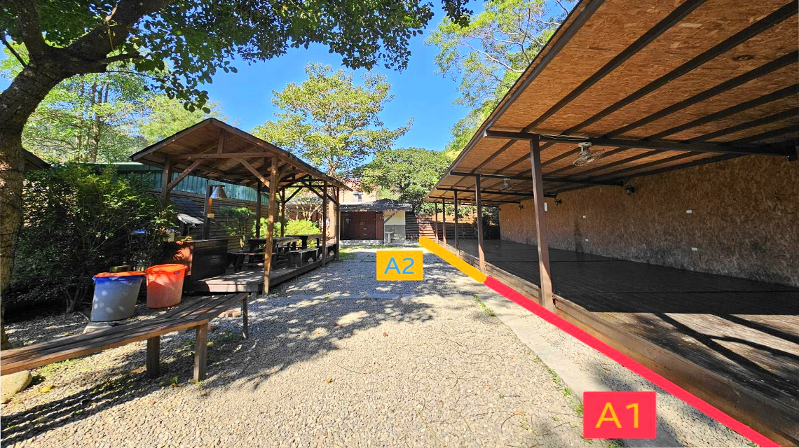 ※ 雨棚棧板區A、雨棚棧板區B:棧板區四個角落皆有固定鐵環座可固定帳篷繩子,且每個棧板之間有間隔5公分,前方跟後方草地都有預留空間可以下釘。