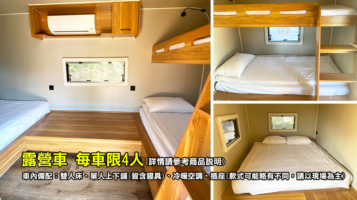 ●車內設備:雙人床墊、單人上下舖(皆含寢具)、冷暖空調、電源插座。
