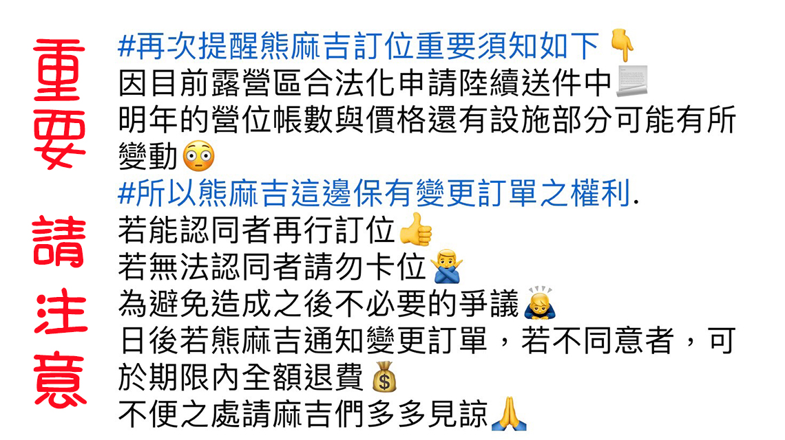 ※ 夜衝需求請自行於入住3天前至熊麻吉FB粉專向與營主登記,未登記者恕無法進場。
