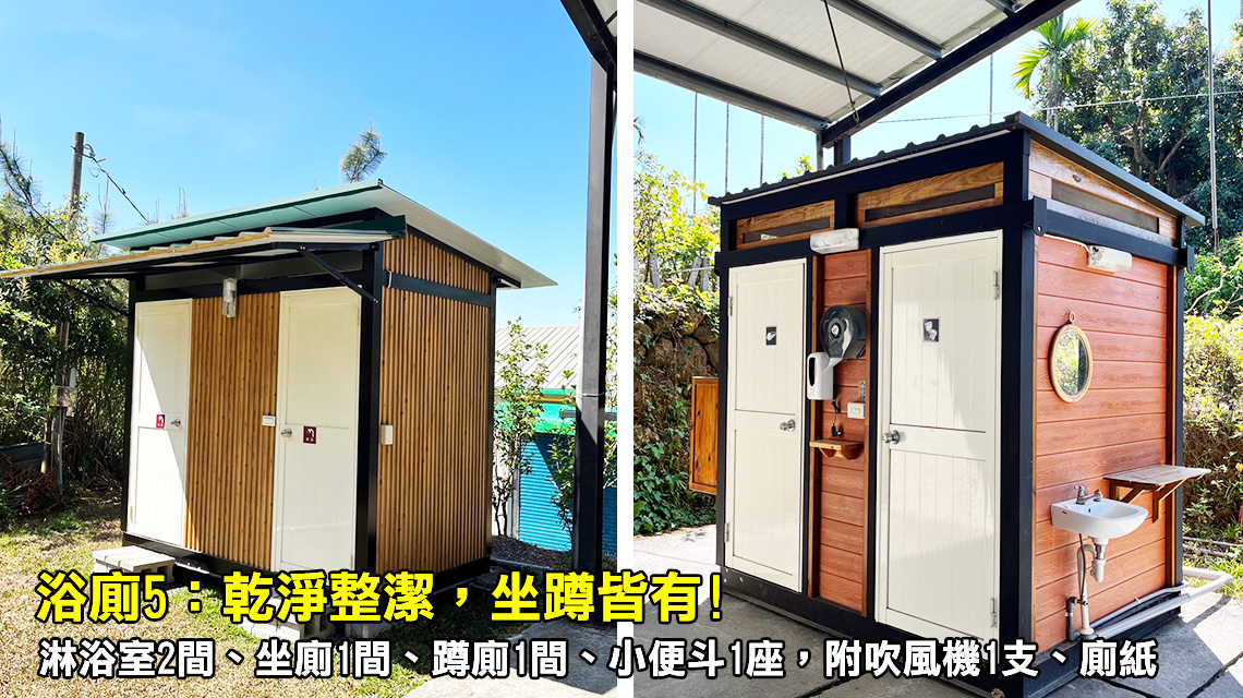 ※ 衛浴5:淋浴室2間,坐廁1間、蹲廁1間、小便斗1座,附吹風機1支、廁紙。
