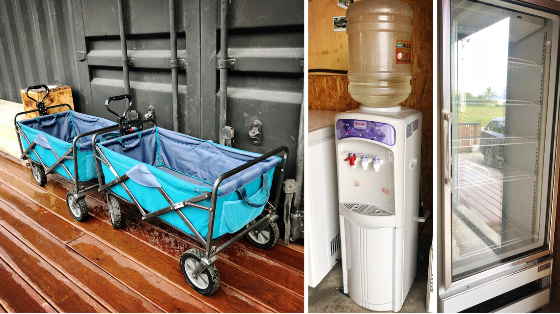 配置飲水機、冰箱,另有提供推車運送裝備,用畢請歸還原位