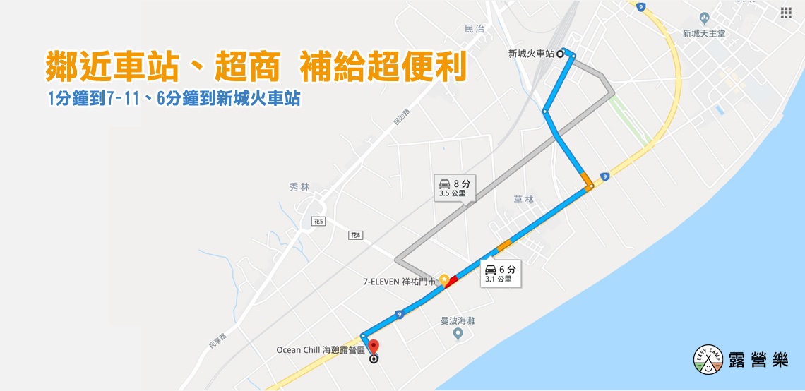 ● 營區1分鐘到7-11,5分鐘到新城火車站,距離花蓮市區約20分鐘車程,補給/用餐很方便。