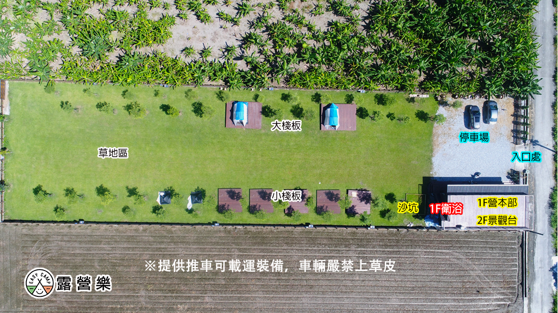 1. 車輛禁止上草皮,提供推車讓露友載運裝備至營位。