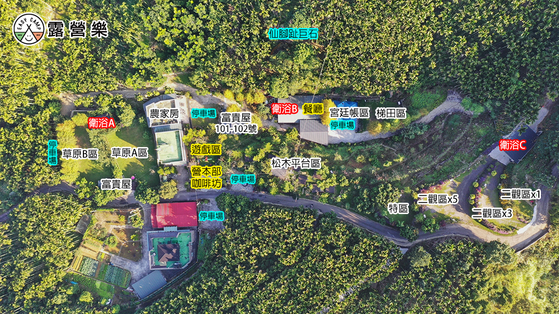 梯田區:水槽2座、電箱3座(請備延長線10米以上),集中停車。