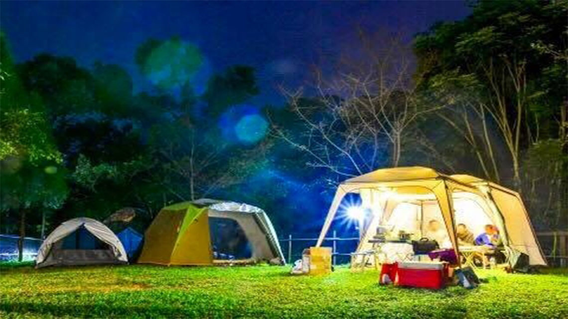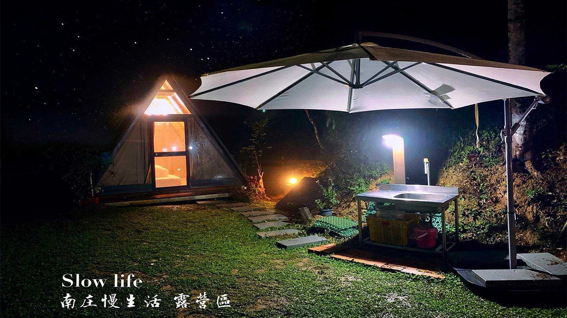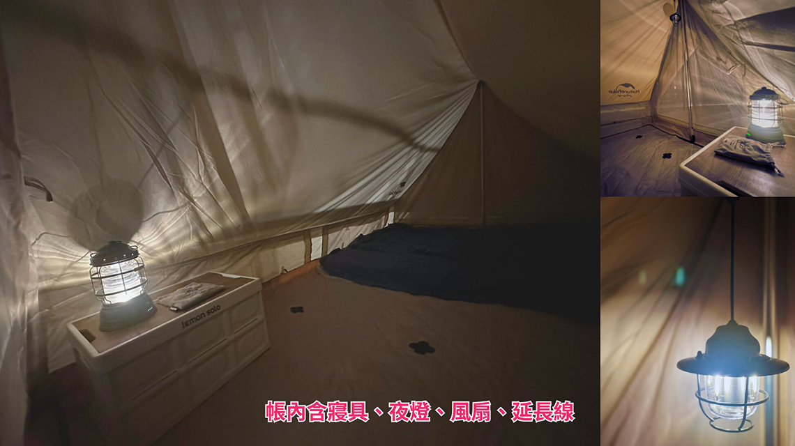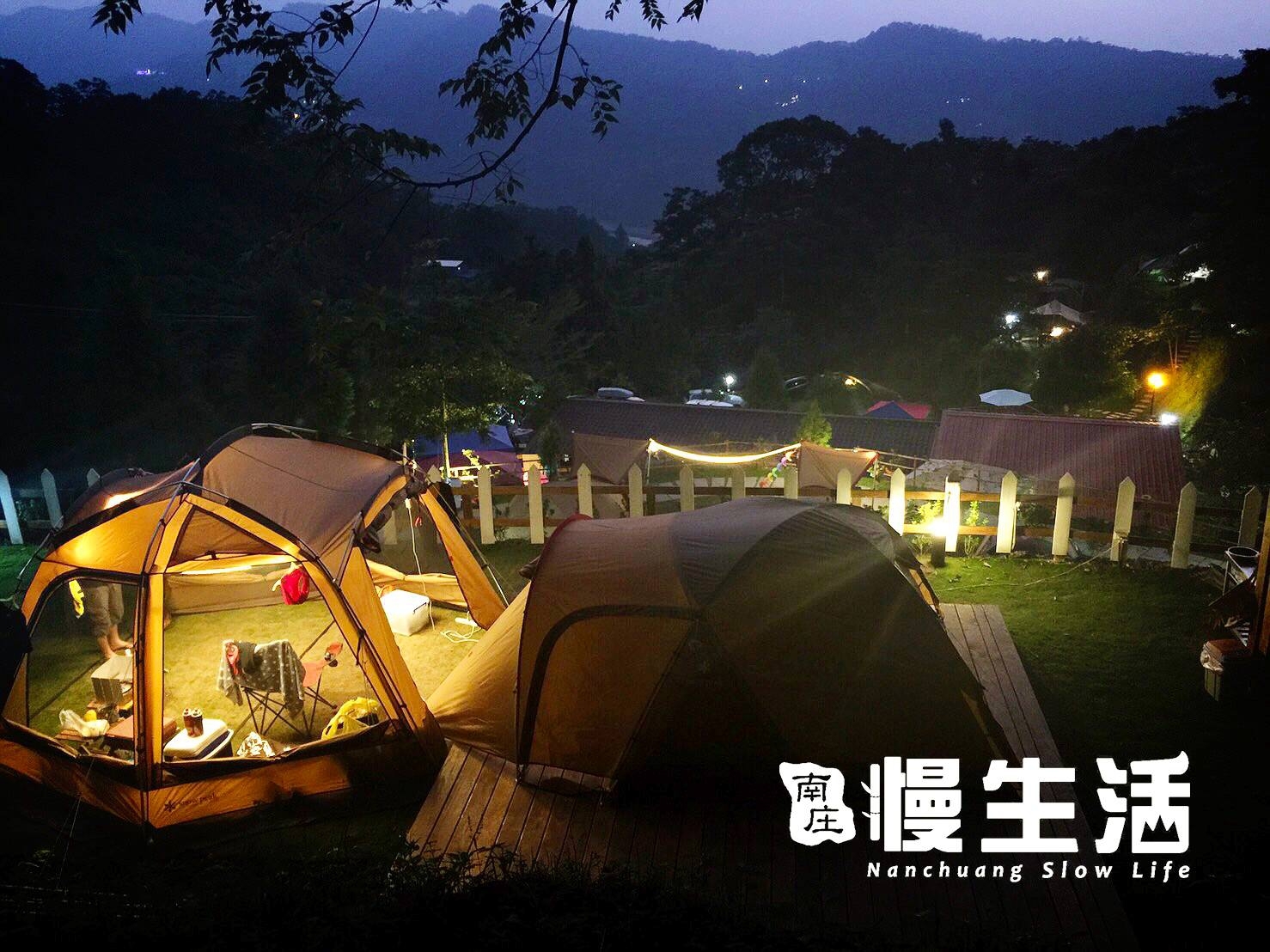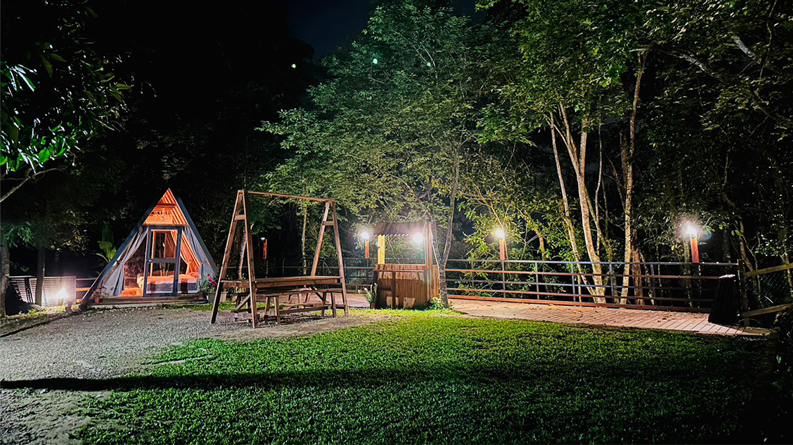 夜晚帳篷燈火相映 造景庭園浪漫相伴