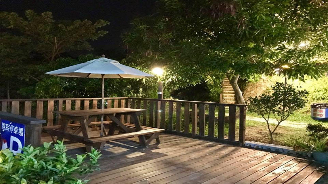 本區戶外配置:洗手槽x1、插座x1、雙人桌椅x1、陽傘x1