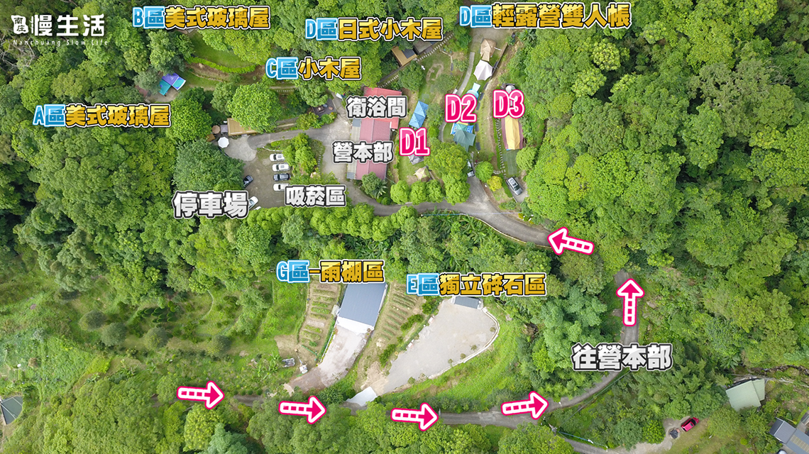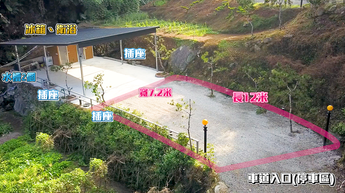 *此區為集中停車、共用衛浴,裝備可於入口卸貨,用手推車推入。