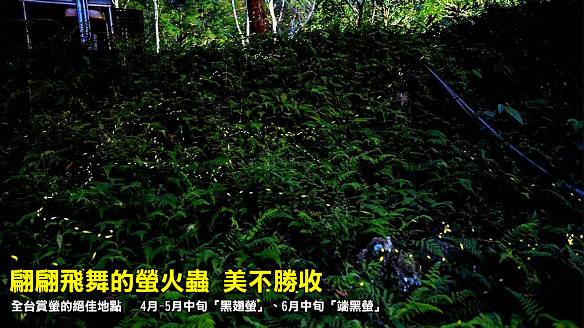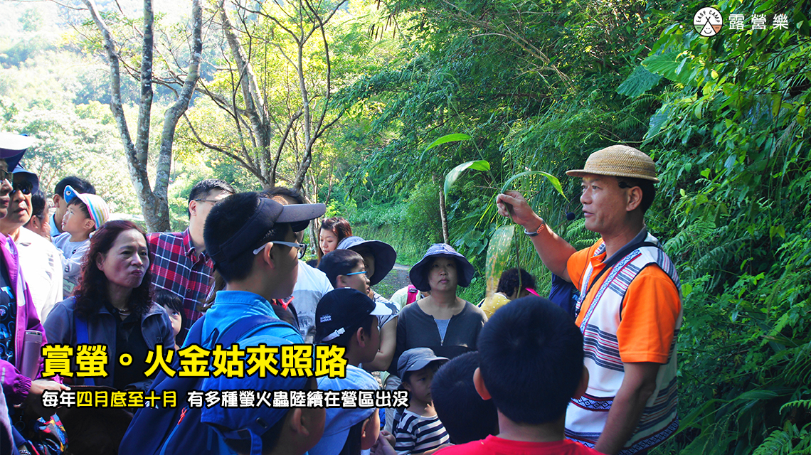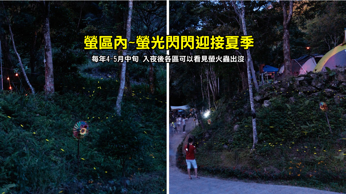 ※ 螢火蟲季:4月-5月中旬「黑翅螢」、6月中旬「端黑螢」、10月底「山窗螢」,最佳觀賞營區,營區內即可賞螢喔~