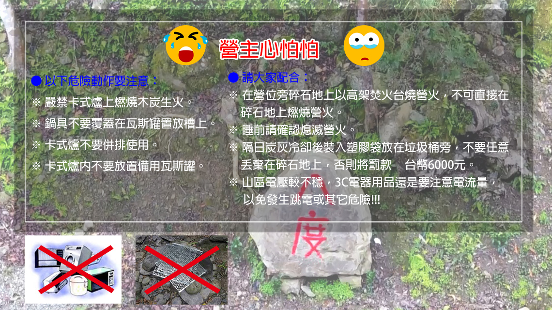 ※ 在營位旁碎石地上以高架焚火台燒營火,不可直接在碎石地上燃燒營火。