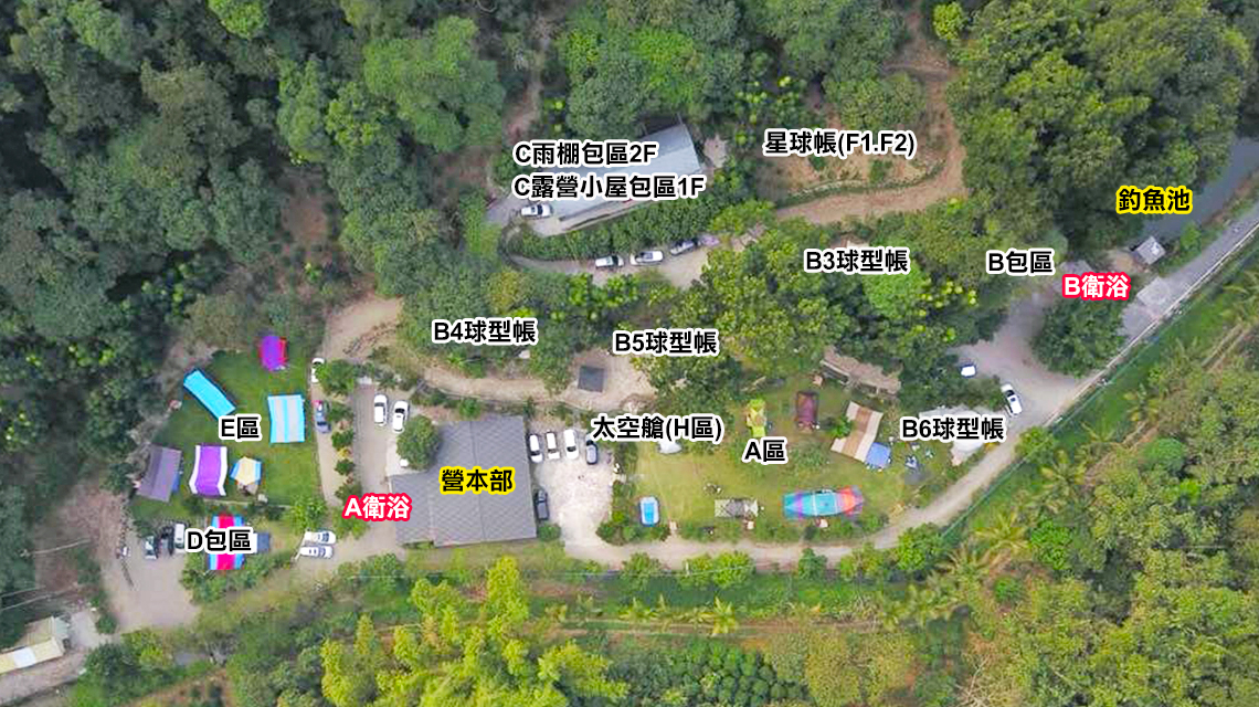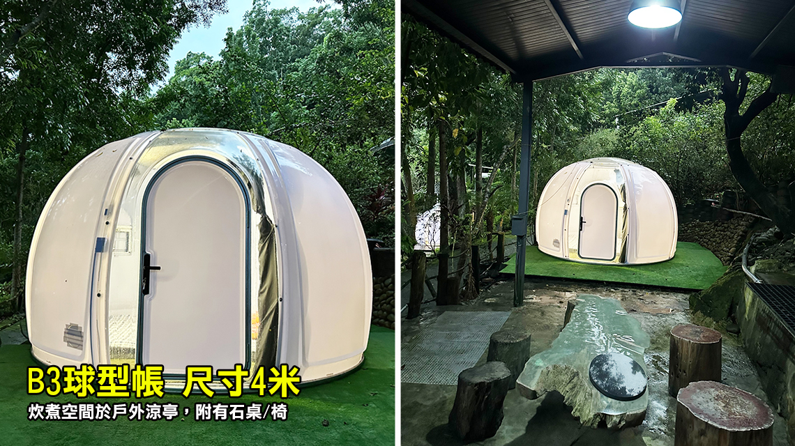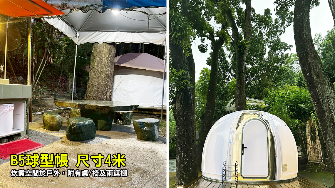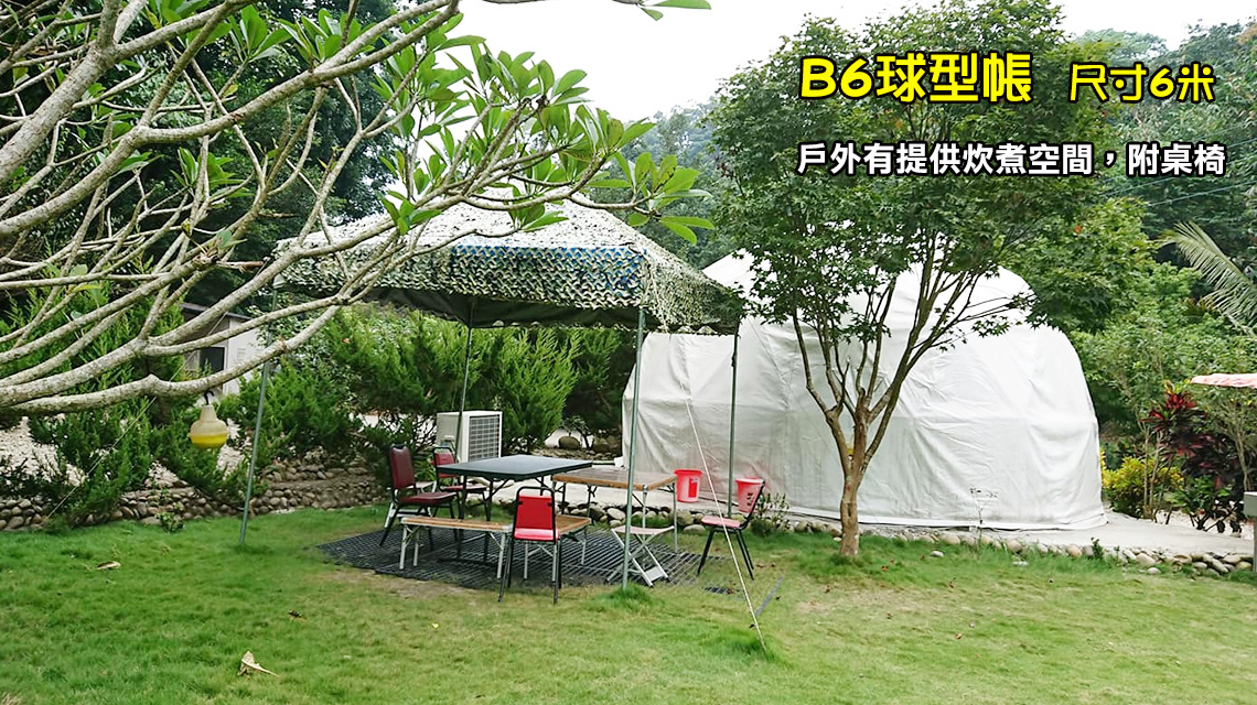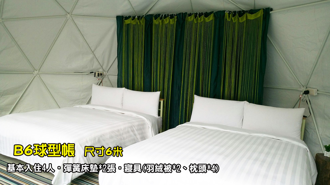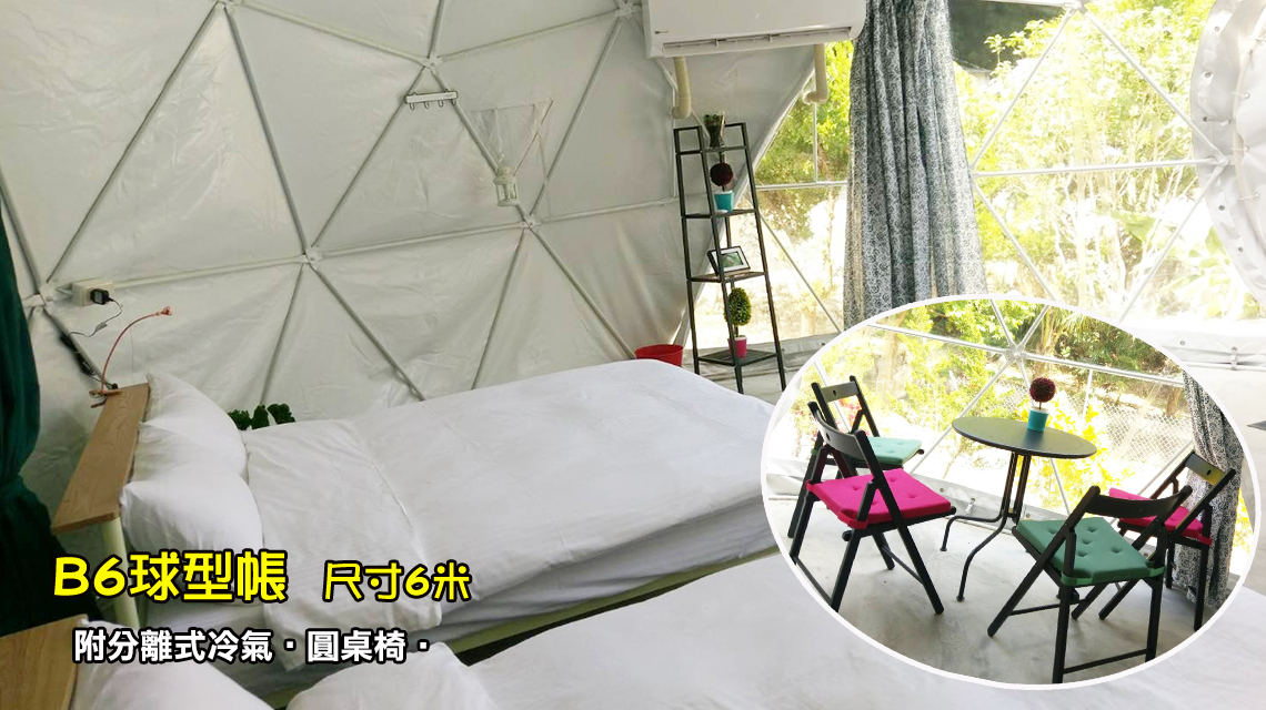※ B6球型帳:內含彈簧床墊*2.寢具(羽絨被*2&枕頭*4).分離式冷氣.圓桌椅,基本入住4人(可加2人 $200/人 無提供加床服務,請洽客服備註訂單)。