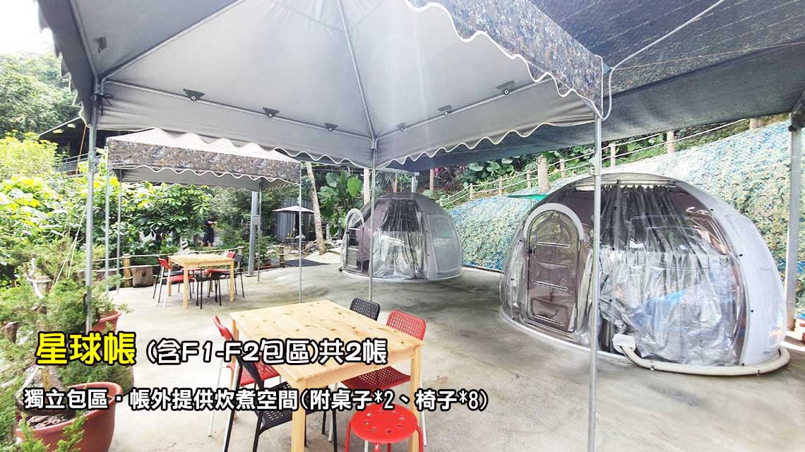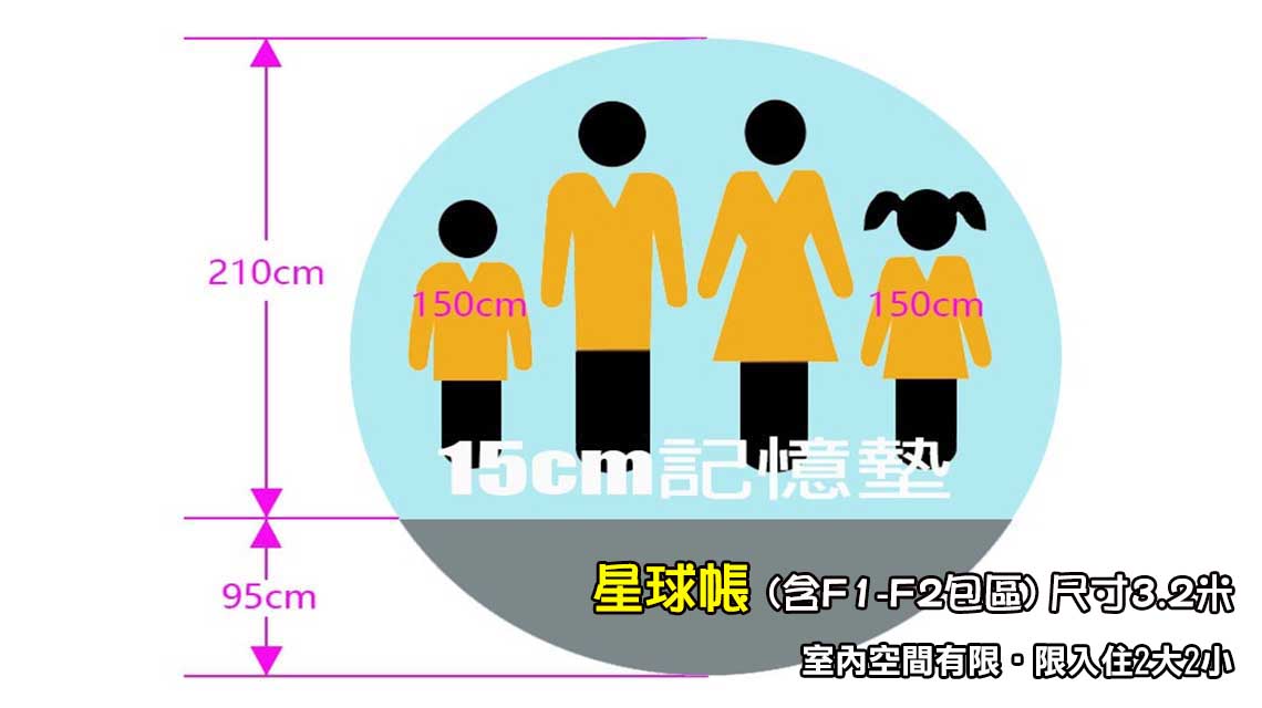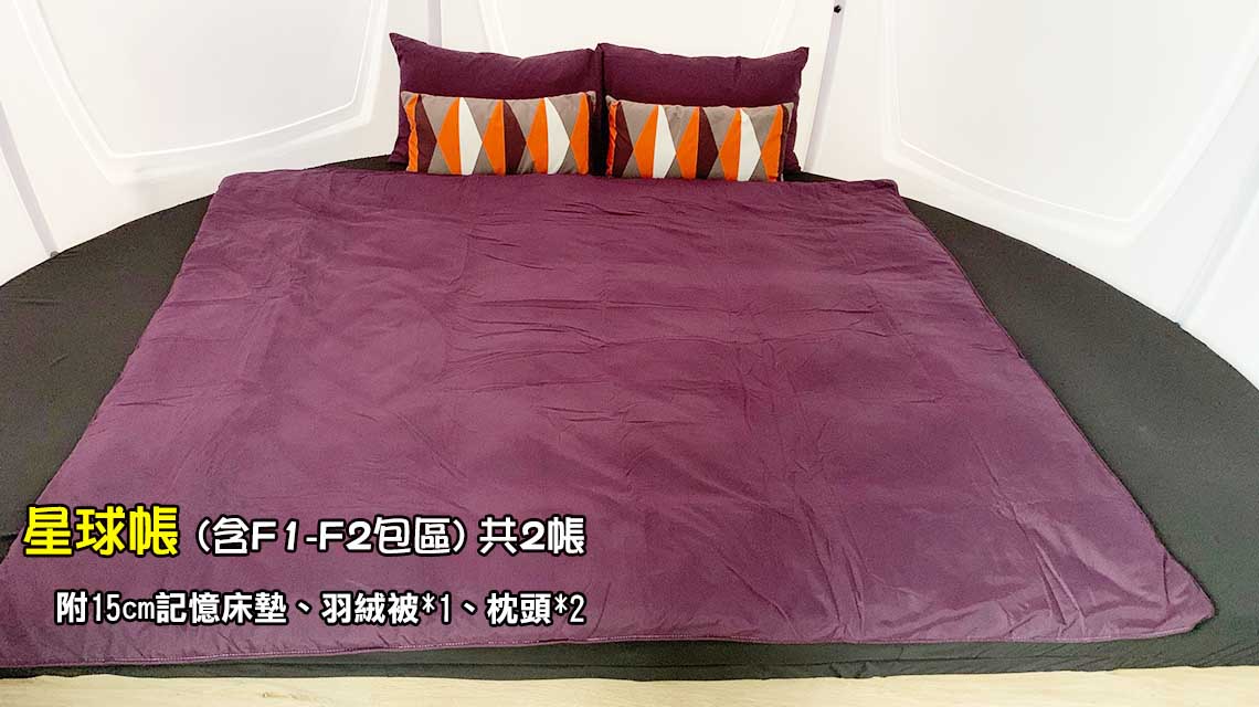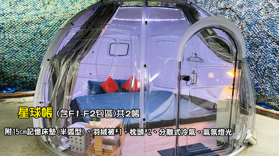※ 星球帳(含F1+F2包區):帳內附有15公分記憶床墊(半弧型)、羽絨被*1、枕頭*2、分離式冷氣、氣氛燈光,限入住2大2小,無法加人。