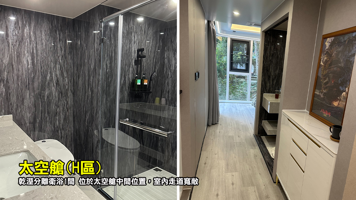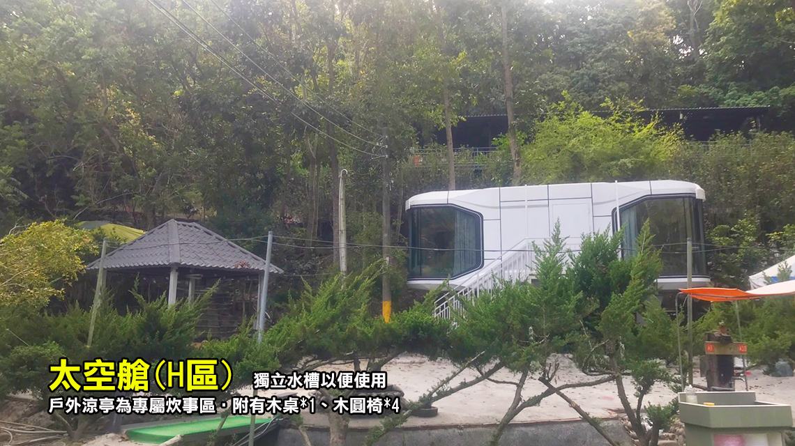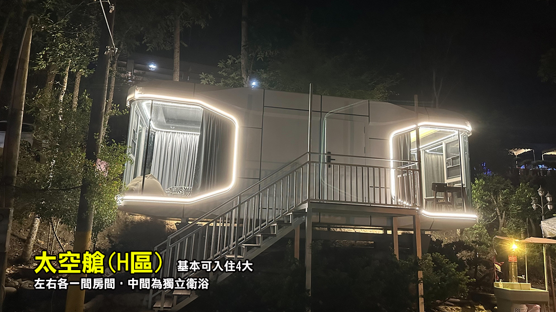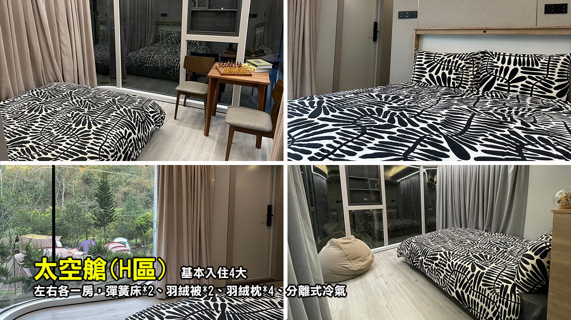 ※ 太空艙(H區):內含彈簧床*2、附分離式冷氣、羽絨被*2、羽絨枕*4,可入住4大,無法加人。