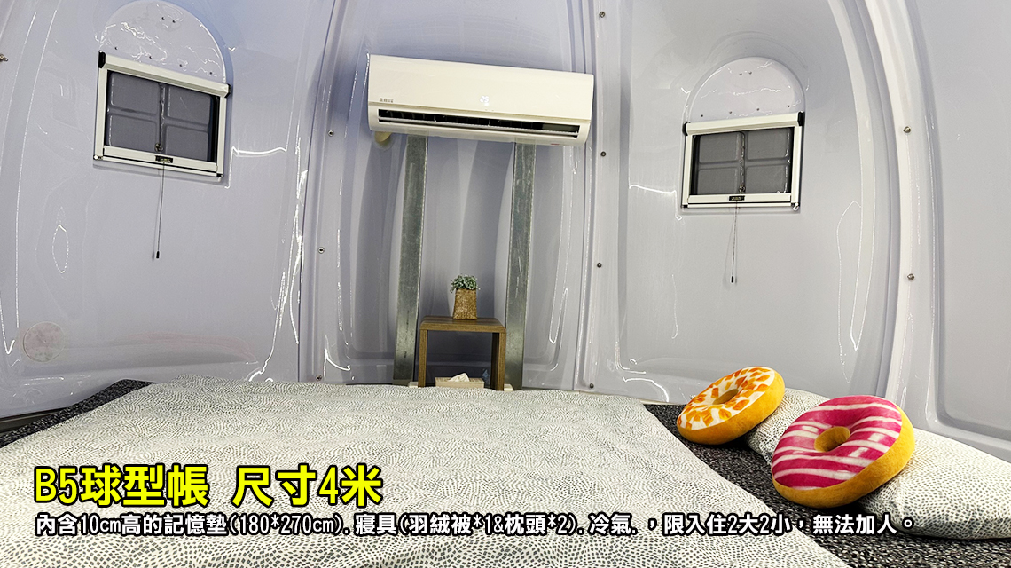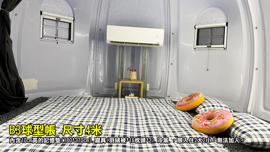 ※ B3、B4、B5球型帳:內含10cm高的記憶墊(180*270cm).循環扇.寢具(羽絨被*1&枕頭*2).移動式冷氣.小桌椅,限入住2大2小,無法加人。