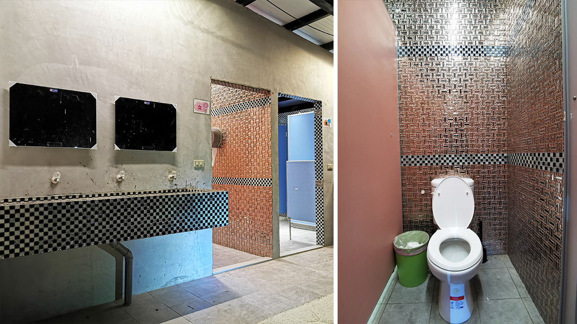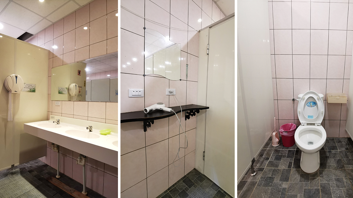 衛浴A:男坐廁2間、蹲廁2間、便斗2座、淋浴室6間;女坐廁2間、蹲廁3間、浴室6間。
