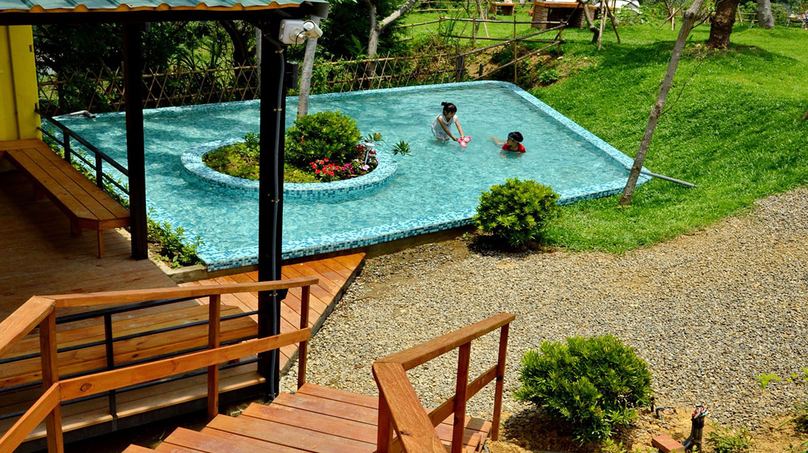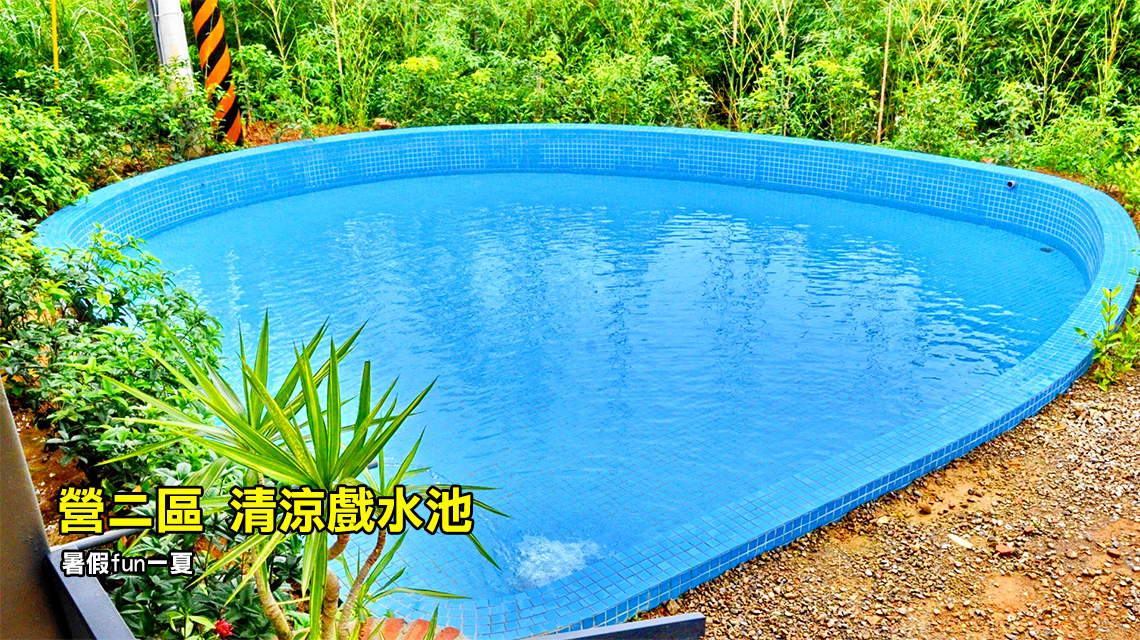 2. 營二區浴廁旁的戲水池很大很漂亮,但水質沒有很乾淨。隔天一早要去玩水,被小動物屍體嚇到不敢下水。