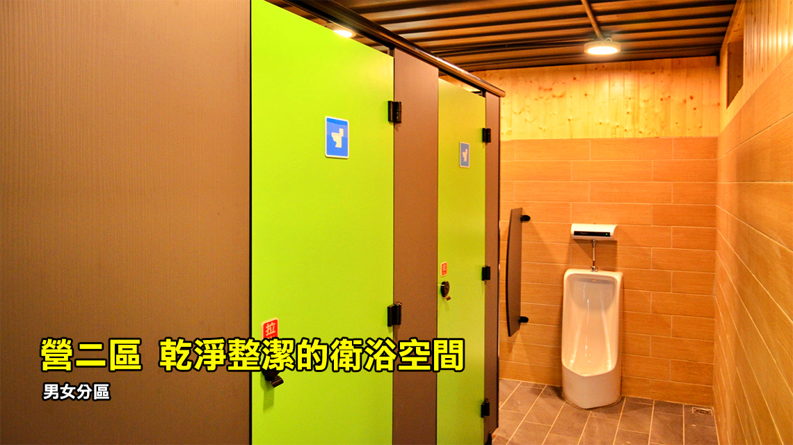 營一區:男生坐廁2間、蹲廁1間、小便斗2座、浴室7間;女生坐廁2間、蹲廁1間、浴室6間。