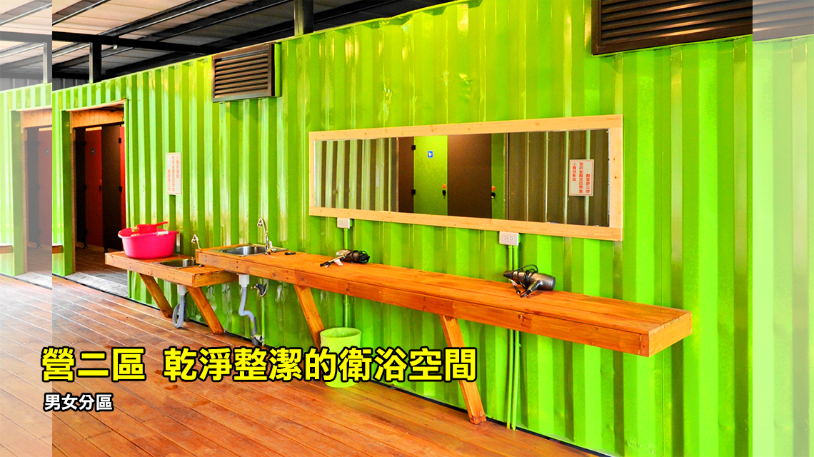 營二區:男生坐廁2間、蹲廁1間、小便斗2座、浴室7間;女生坐廁2間、蹲廁1間、浴室6間。