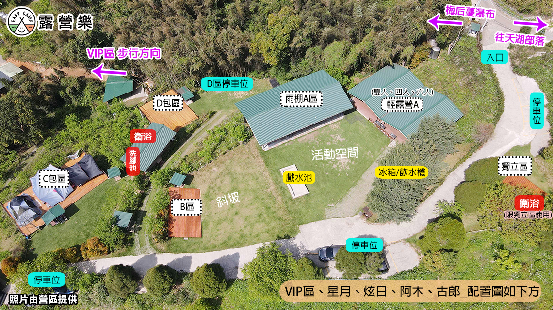 ※ 該區每帳附有:專屬衛浴(坐式)、專屬冰箱(冷藏/冷凍)、水槽(冷/熱水)、專屬木桌椅、3個插座。