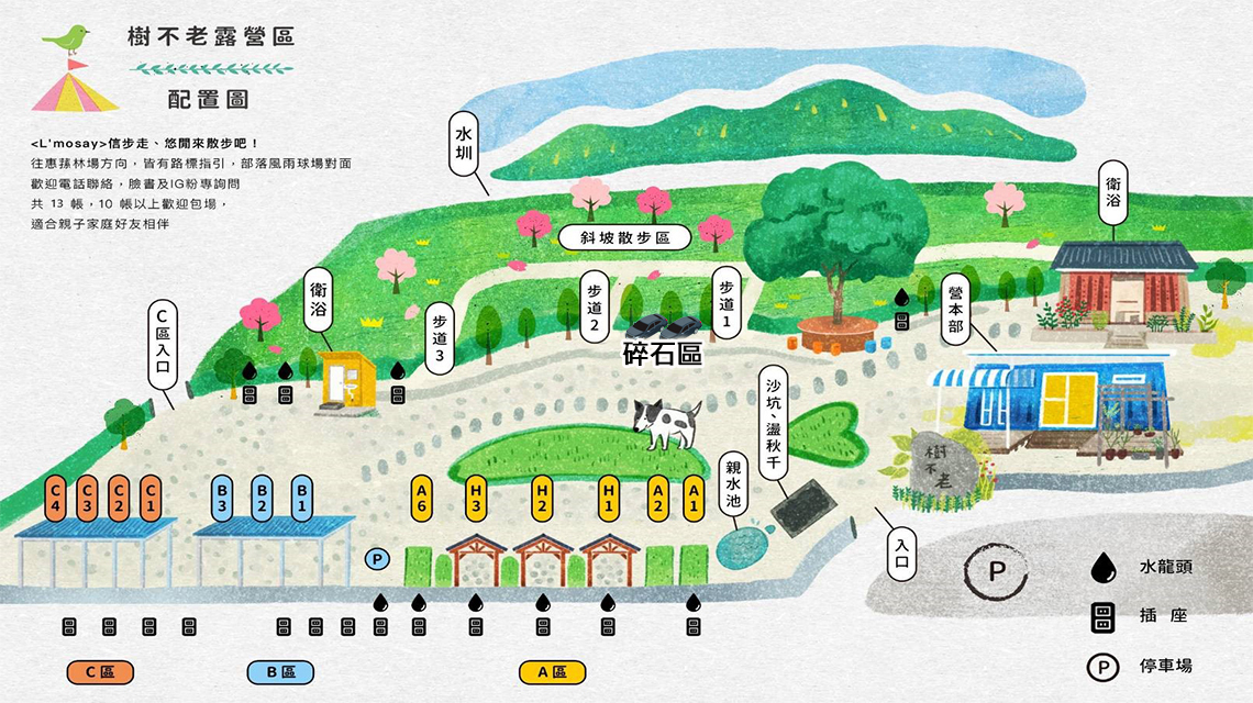 7. 營區屬戶外環境,與大自然的昆蟲、螞蟻...動植物共生存,不以噴灑藥物處理,敬請自備防蚊液、止痛藥膏等個人藥品。