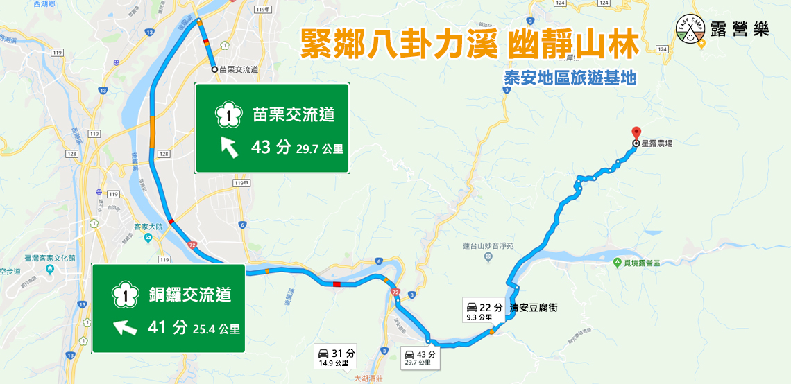 國道一號→下苗栗(132K)交流道→左轉72號(15K公館交流道)快速道路→往泰安方向直駛(導航至苗栗縣泰安鄉公所(清安豆腐老街)台62線,錦卦大橋左轉,八卦村直走,土牧譯繼續往上走,就可抵達舒適的星樂親子露營區。
