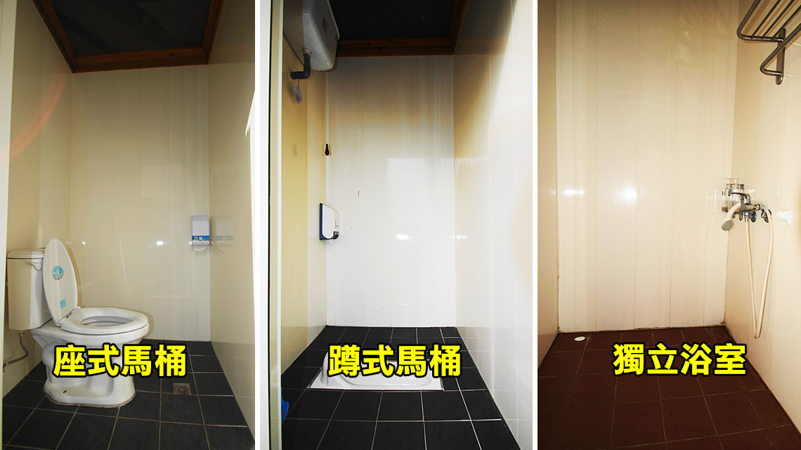 A區男女共用蹲廁4間、坐廁2間、淋浴間6間、小便斗4座