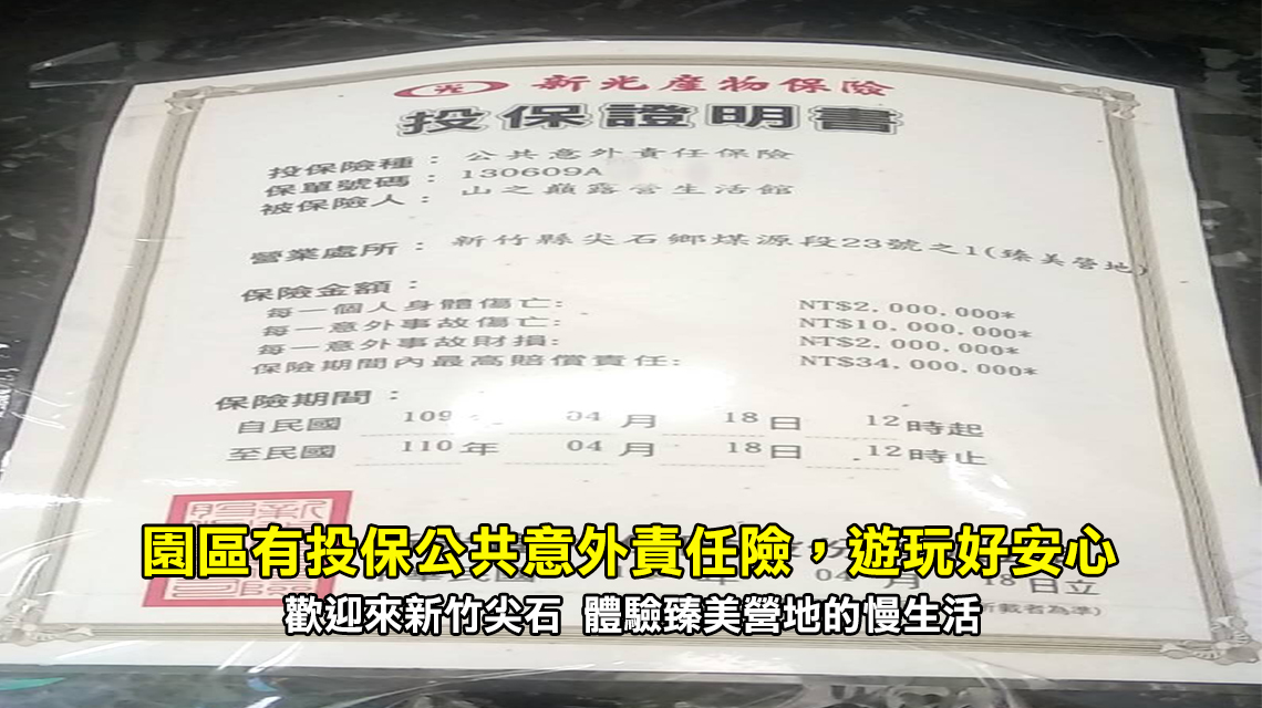 ※ 從事戶外露營活動請注意自身活動安全,本營區另為露營貴賓投保公共意外險。