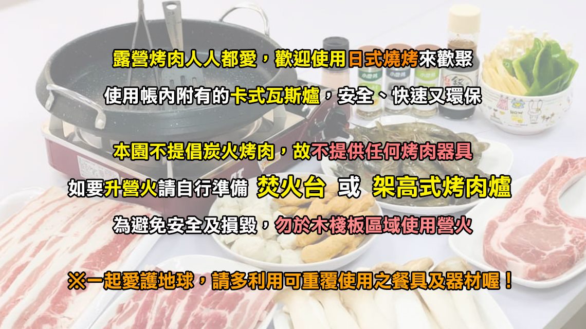 ※ 禁止營火行為:本園區只能烤肉,需自備架高烤爐並移出帳篷範圍才可使用,結束後要等灰燼冷卻才能丟棄。其他任何營火行為一律禁止。