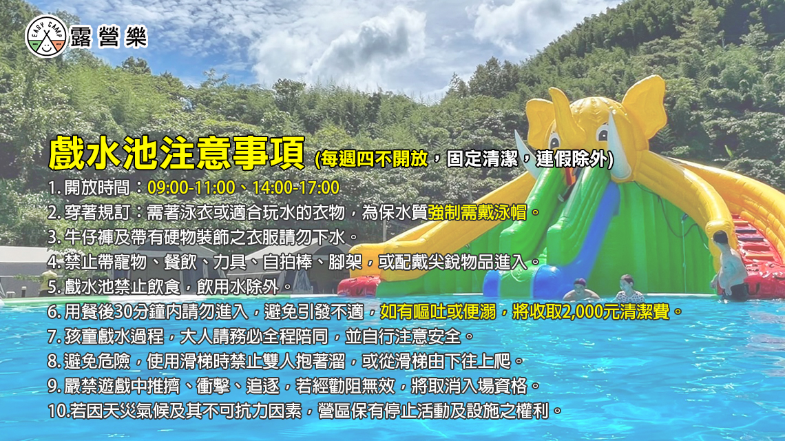 ** 冬天因山上水溫冷、氣溫低,故進入夏季時,約6月份時才會視天氣況狀開放戲水池,時間:09:00-1100、15:00-17:00,詳洽營主確認 0939908209,不便之處請見諒。