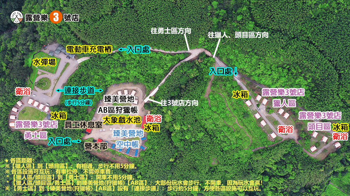 ※ 【臻美營地(狩獵帳)【AB區】到【勇士區】到,設有「連接步道」:步行約5分鐘,方便各區設施可以互玩。