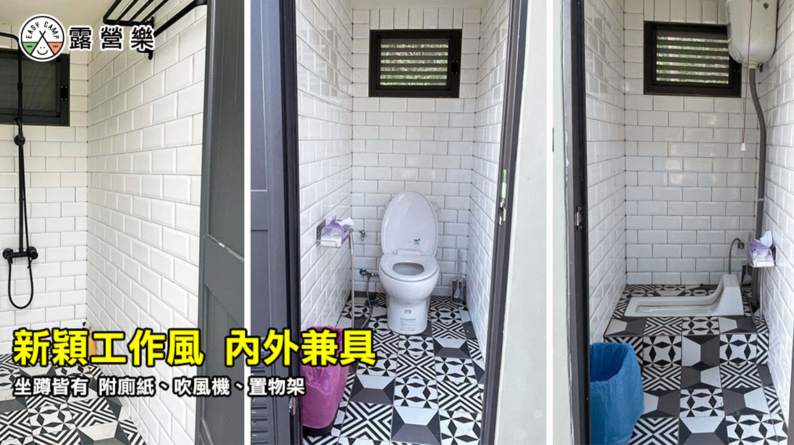 ※ 男女共用蹲廁2間、坐廁6間、浴室10間、小便斗3座,車停營位旁。