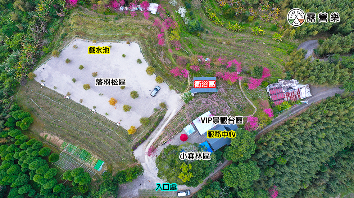 小森林區:水槽 1 座、電箱 3 座(含插孔6個)(請備延長線5米),下裝備後.集中停車區。