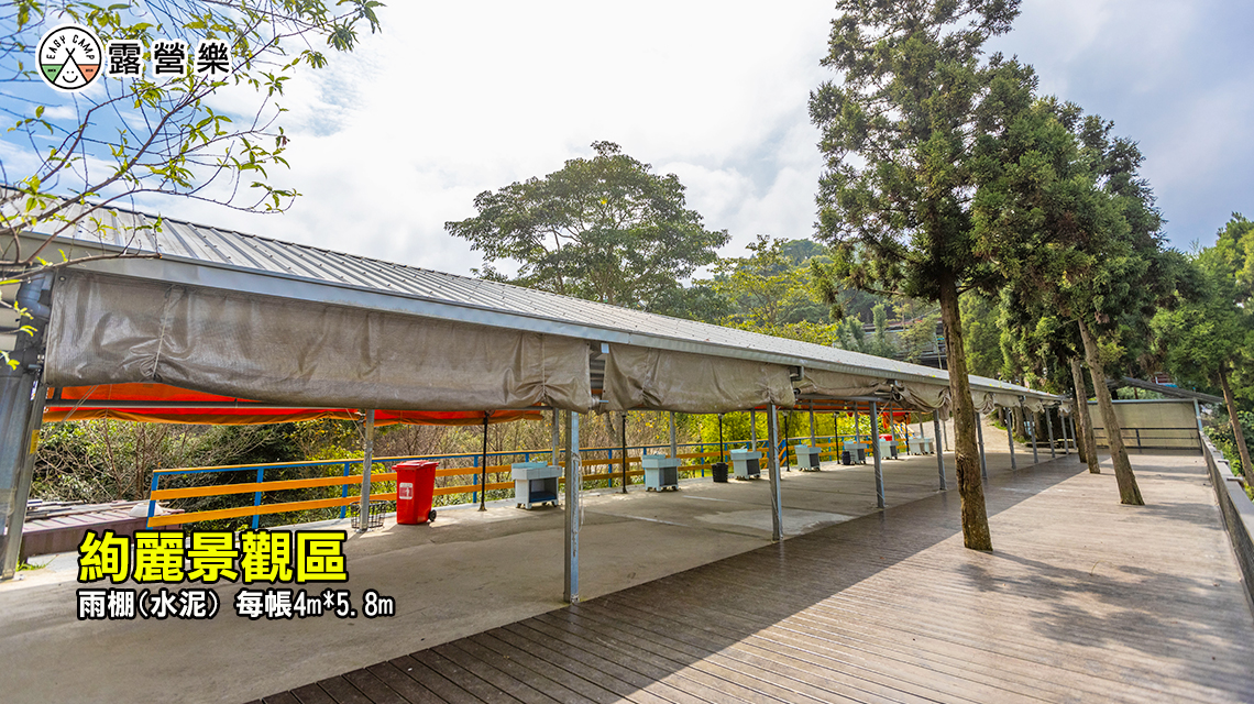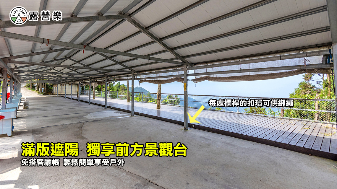 這次預約雨棚區: 大概可以搭8帳,我們是拿到轉角的營位,位置很大! 在棧板上面,看其他人的雨棚營位是在水泥地上,可到棧板區看風景,不過走動會連帶影響