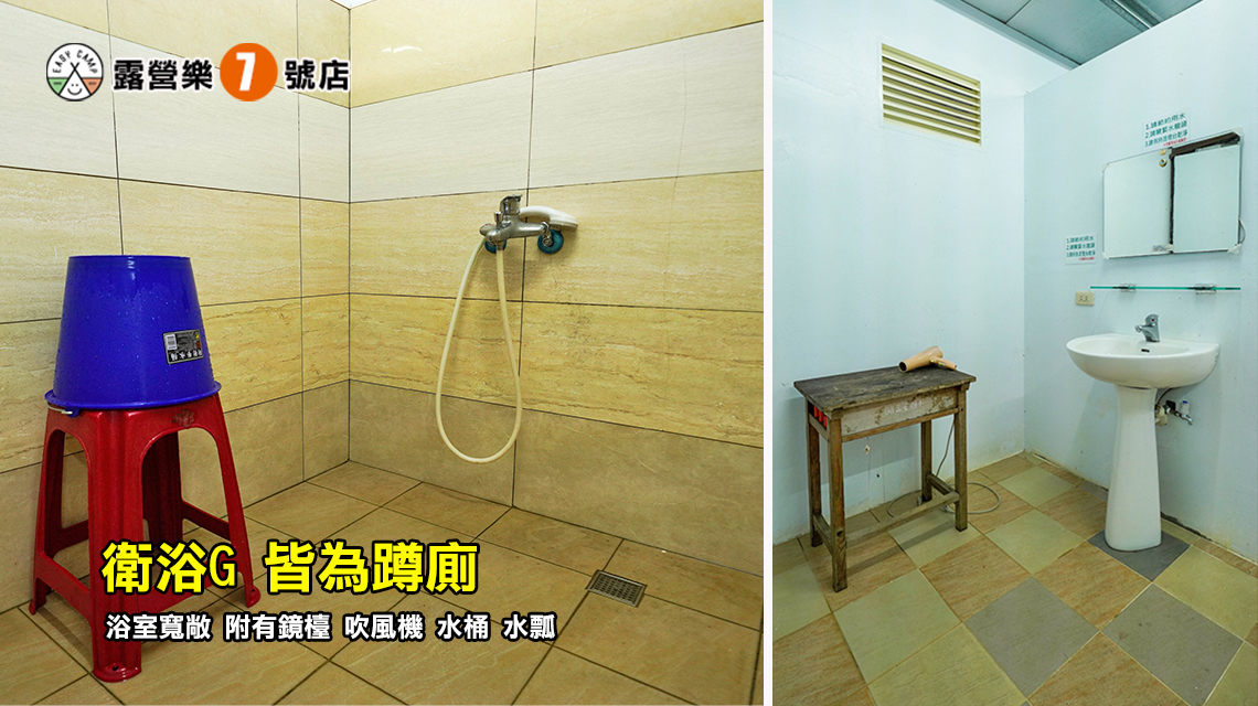 衛浴G:男蹲廁2間、浴室2間、便斗1座;女蹲2間、浴室2間。