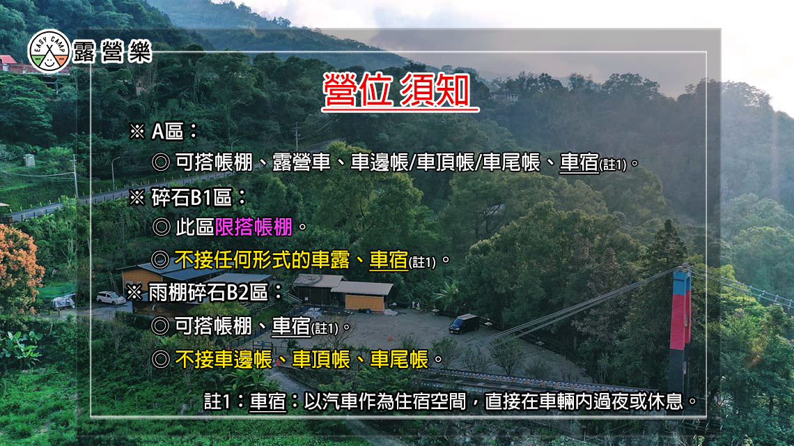 ※ 每營位限搭1睡帳、1客廳帳,附1停車位 【紮營汽車下裝備後集中停放營區外停車場】 (加車不收費,但須來電備註訂單,以營主安排停車)。