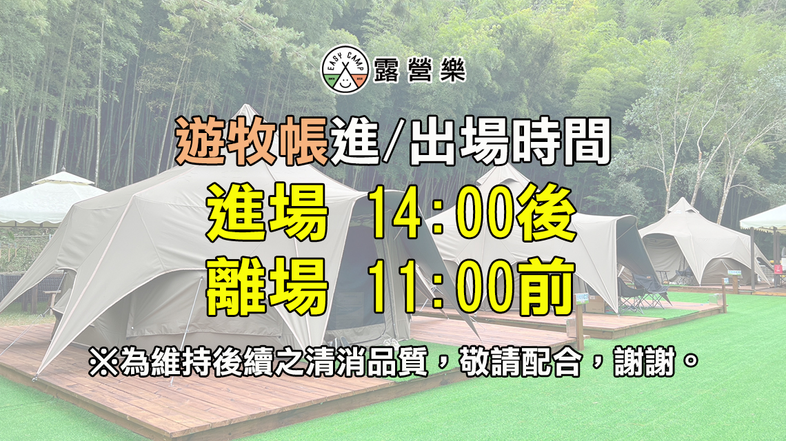 遊牧帳 14:00後進場,隔日11:00前退場(車輛可於"臨停處"搬卸裝備)