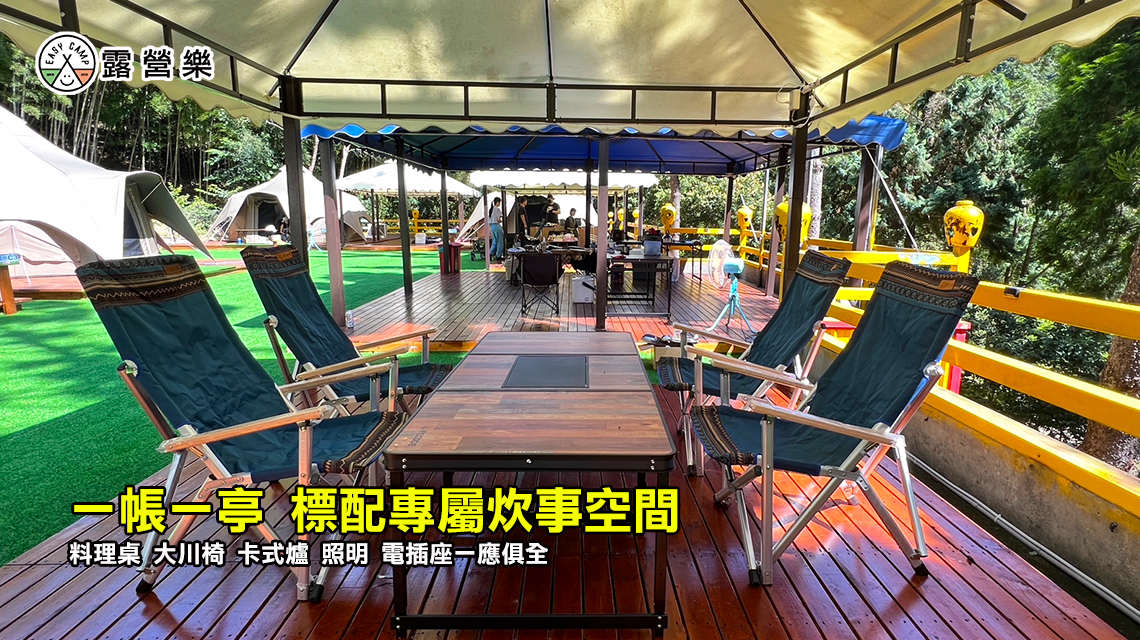 ● 戶外設備:炊事帳、4人桌、大川椅、卡式爐(不含瓦斯罐)、烤盤、電源插座。