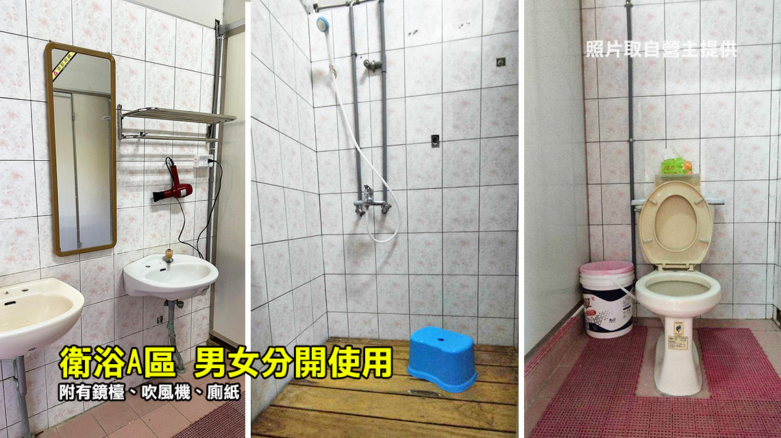 衛浴A:男坐廁1間、便斗4座、浴室1間;女坐廁1間、蹲廁2間、浴室2間。