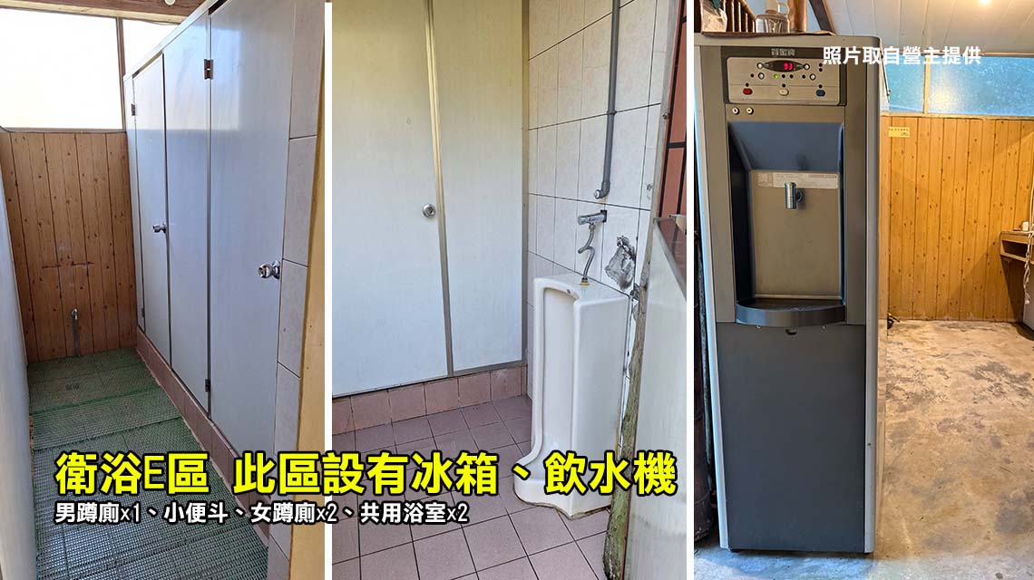 衛浴E:男蹲廁1間、便斗1座、女蹲廁2間;共用浴室2間,此區設有冰箱、飲水機。