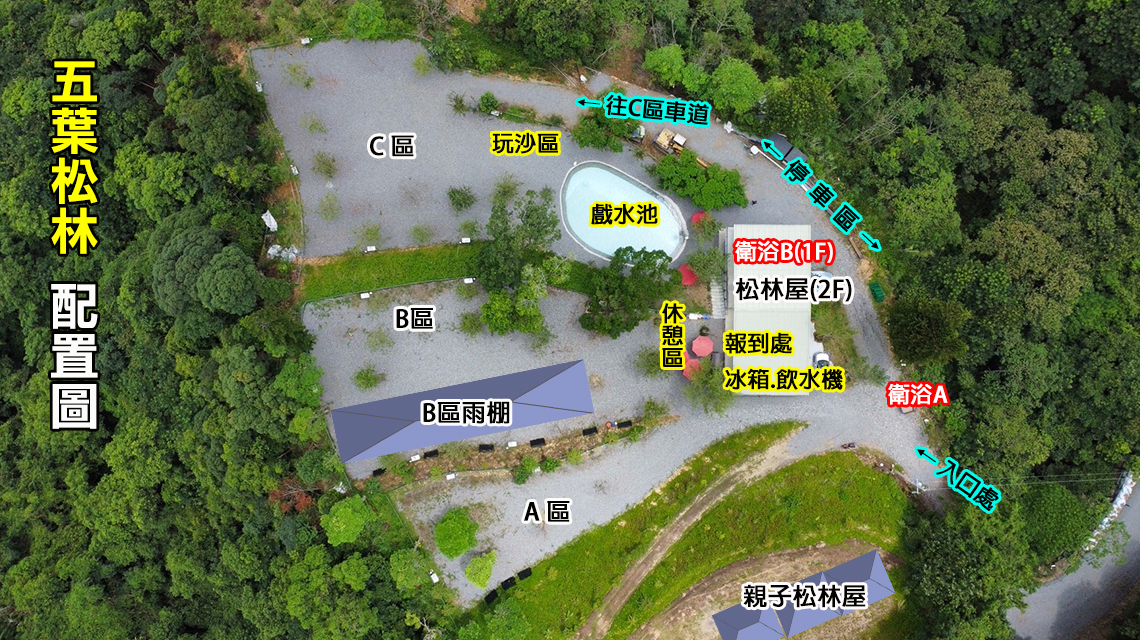 停車:B區雨棚需下裝備後集中停車,其他區可車停營位旁(可車露)。