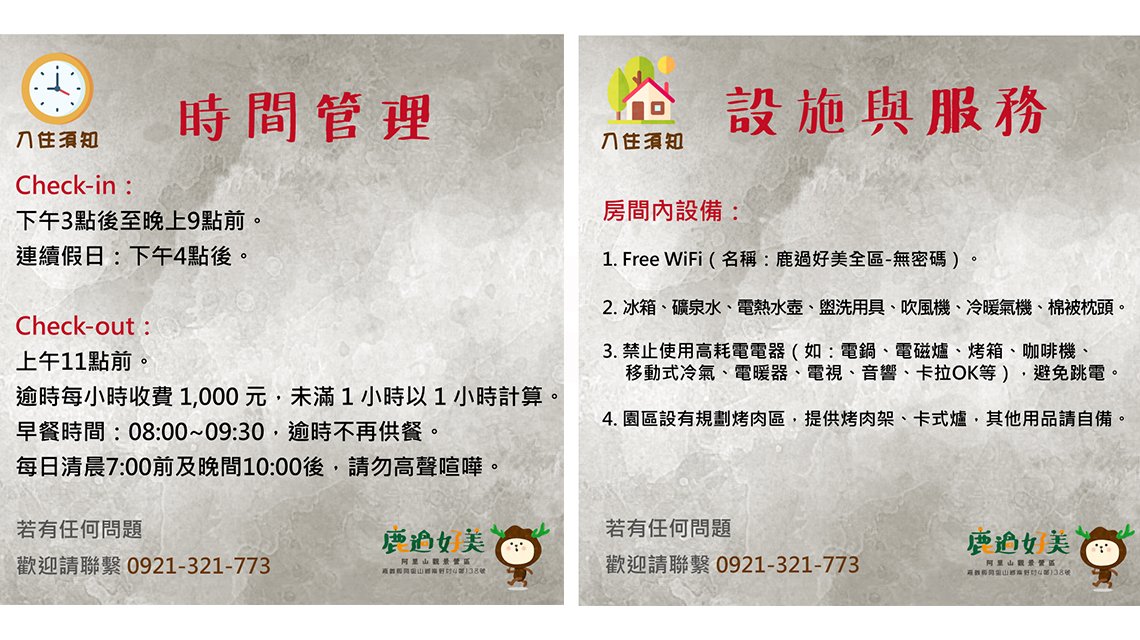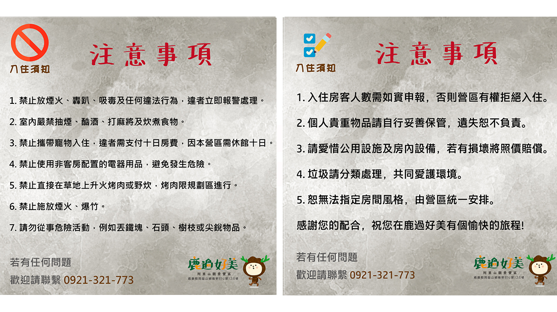 ※ 若有現場問題,歡迎聯繫「鹿過好美宿營區-阿里山」FB粉專,感謝您的配合,祝您在鹿過好美有個愉快的旅程!
