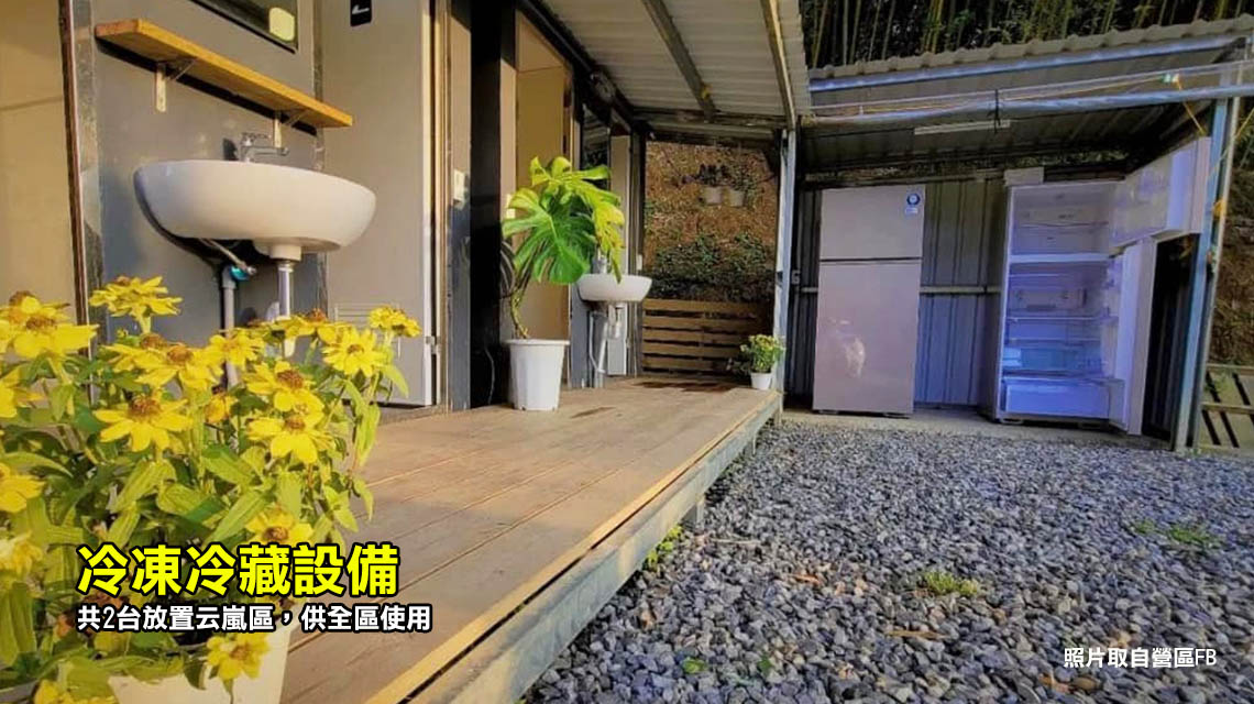 ◎云嵐區:水槽 4 座、前排(6帳)電箱 3 座(每座插孔2個);後排(2帳)電箱 2 座(每座插孔1個),集中停營位旁,可車露。
