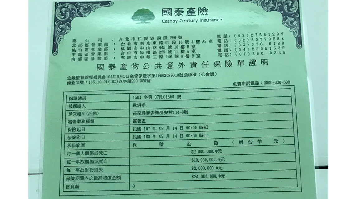 此營區有投保公共意外責任險唷~