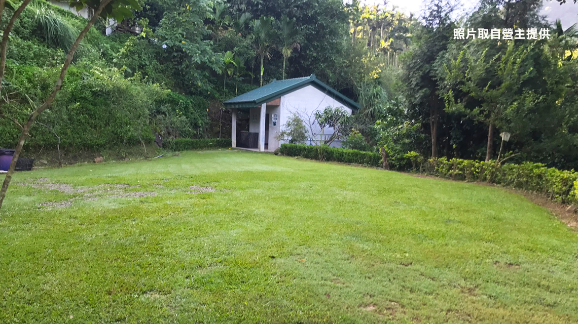 柚子雨棚區 雨棚+棧板 尺寸5M*4M,前方草皮空間相當寬敞