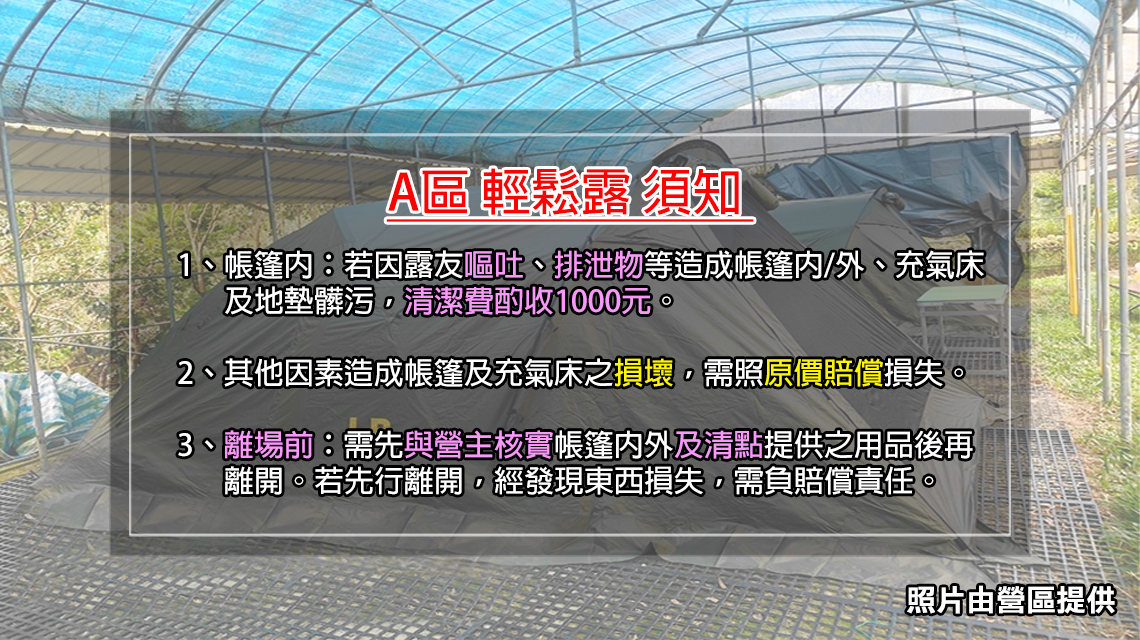 4. 宵禁時間為晚間10點,請避免喧嘩吵鬧,影響到其他露友。